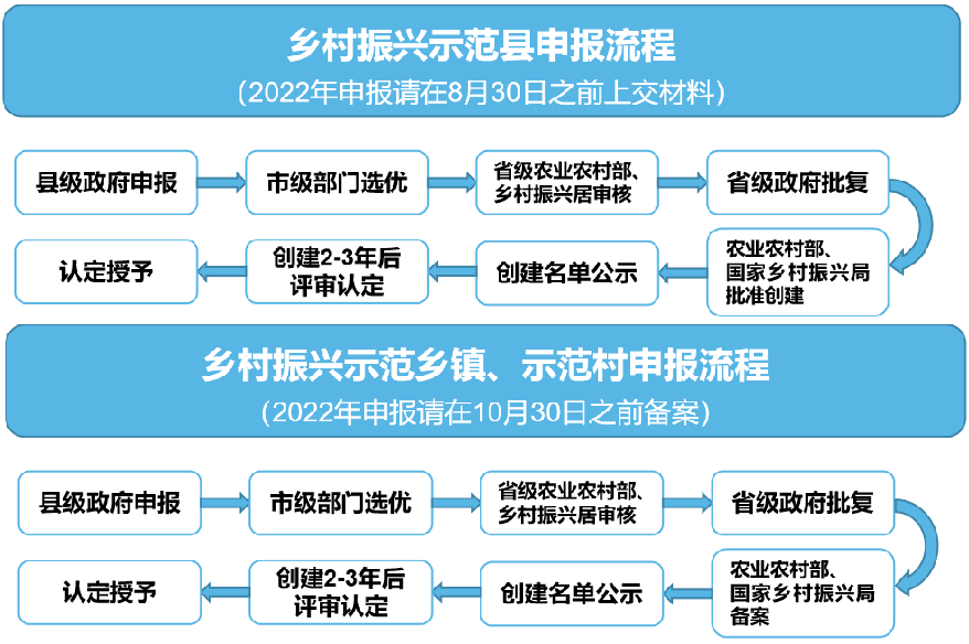 2022年7月20日,農(nóng)業(yè)農(nóng)村部、國家鄉(xiāng)村振興局印發(fā)《關(guān)于開展2022年“百縣千鄉(xiāng)萬村”鄉(xiāng)村振興示范創(chuàng)建的通知》,明確將分級組織創(chuàng)建100個左右國家鄉(xiāng)村振興示范縣,1000個左右鄉(xiāng)村振興示范鄉(xiāng)鎮(zhèn)、10000個左右鄉(xiāng)村振興示范村。